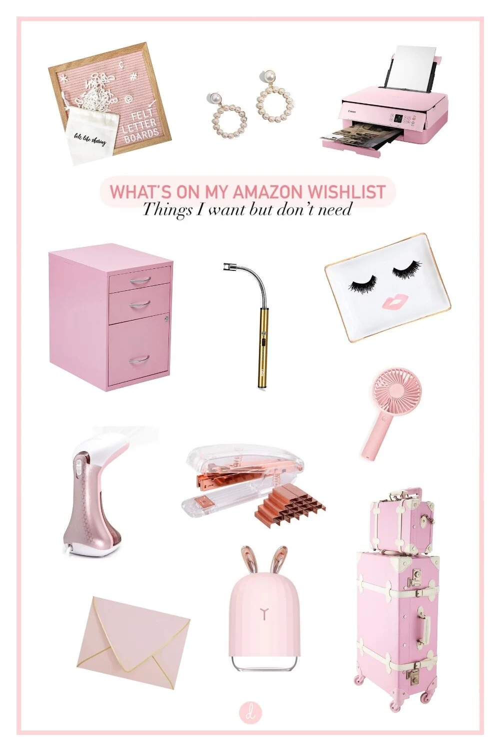 Acrylic Stapler | Mini Handheld Steamer | Metal File Cabinet | Pink Envelopes | Canon Wireless Printer | Pink Felt Letter Board | Electronic Candle Lighter | Eyelashes and Lips Jewelry Dish | Vintage Luggage Set | Mini Handheld Fan | Pearl Circle Pendant Earrings | Cool Mist Humidifier